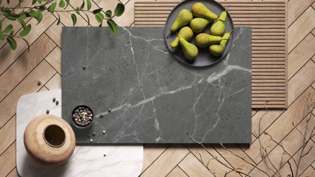 Replicating the sublime luxury of Emperador Fume marble, this Honed finish surface, in a mix of deep greys and earthy tobacco hues, features beautifully defined white veining. Small flakes of mineral deposits, together with subtle oxide layers, heighten the sense of drama
