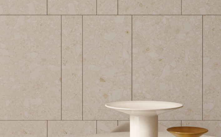 We have drawn on the distinctive, multiform structure of the Italian stone Ceppo di Gré to create an innovative finish in shades of cream not found in nature. A warmer design, particularly suitable for large areas of flooring or cladding, both indoors and out.