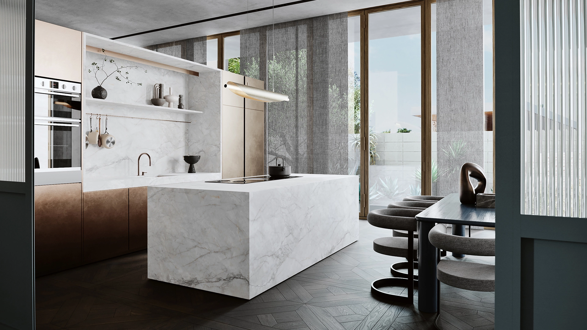 Exquisite Carrara marble style. Bellini Bianco perfectly recreates the understated beauty of Italian Carrara marble in Smartstone sintered surface. Its distinctive delicate brown-grey veins are streaked with subtle amber hues on a warm white backdrop.