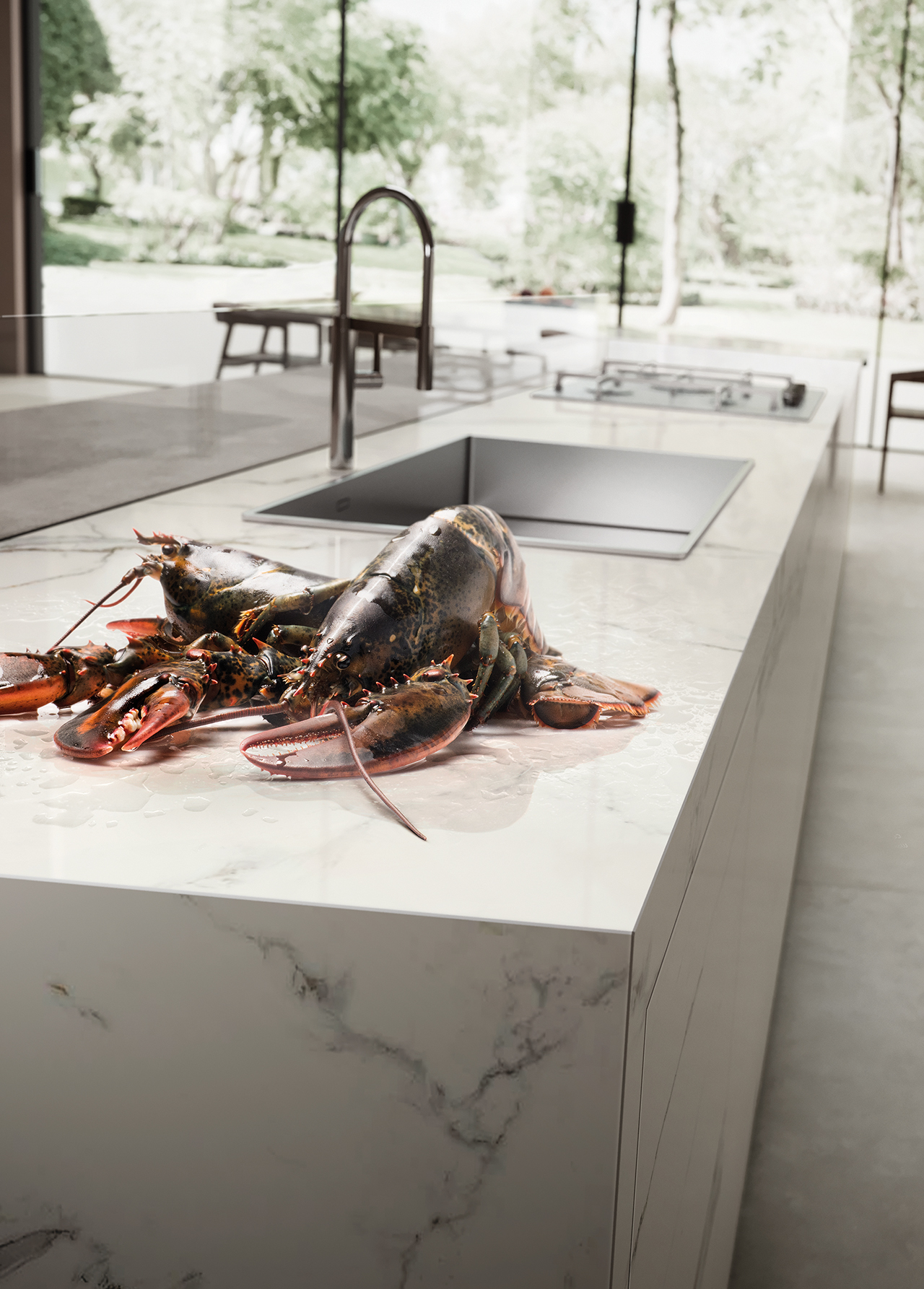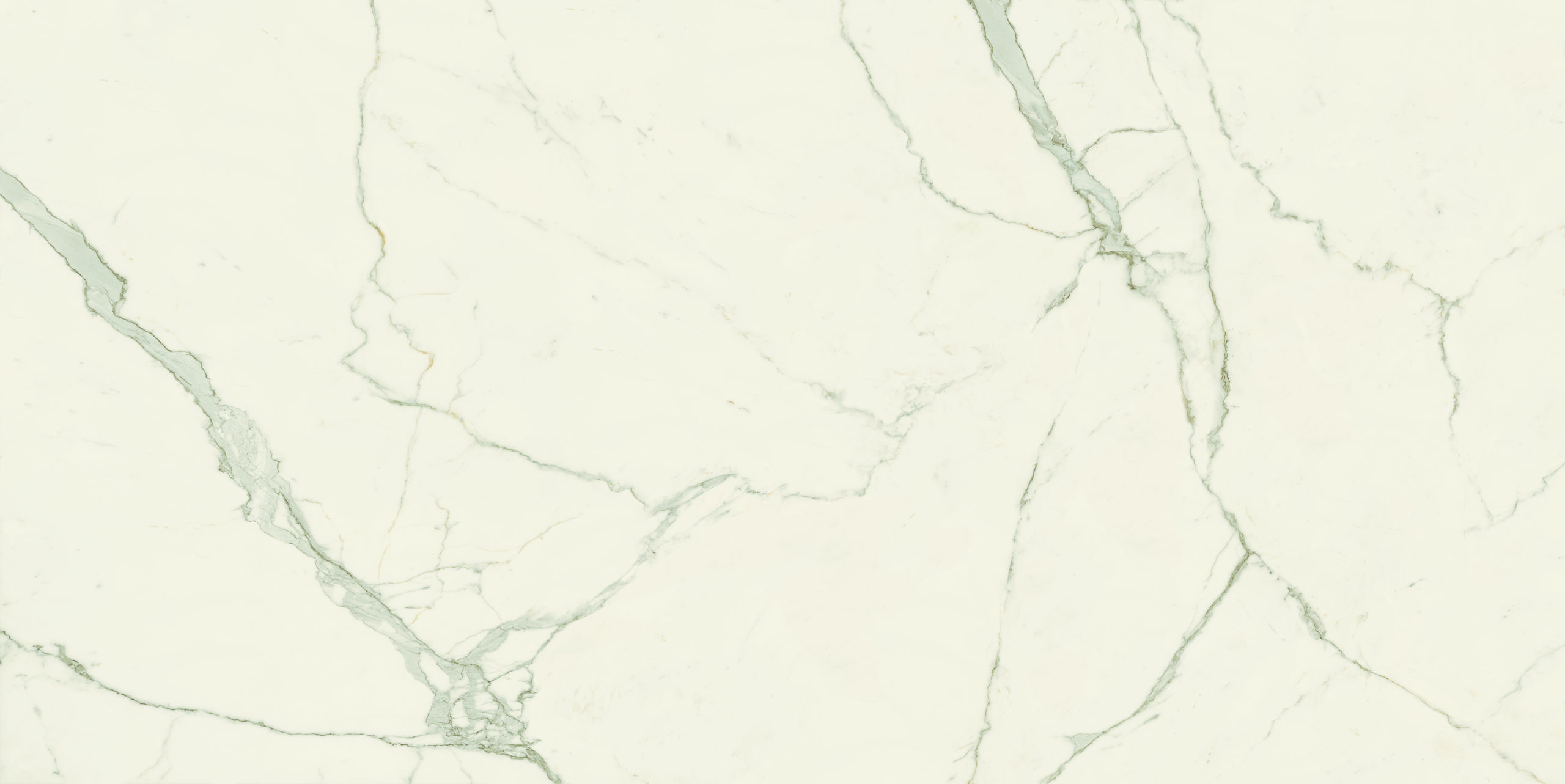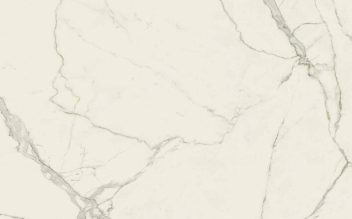 Calacatta Extra is a refined and versatile marble-effect porcelain characterised by a luminous white background, with striking grey veining and gold reflections.