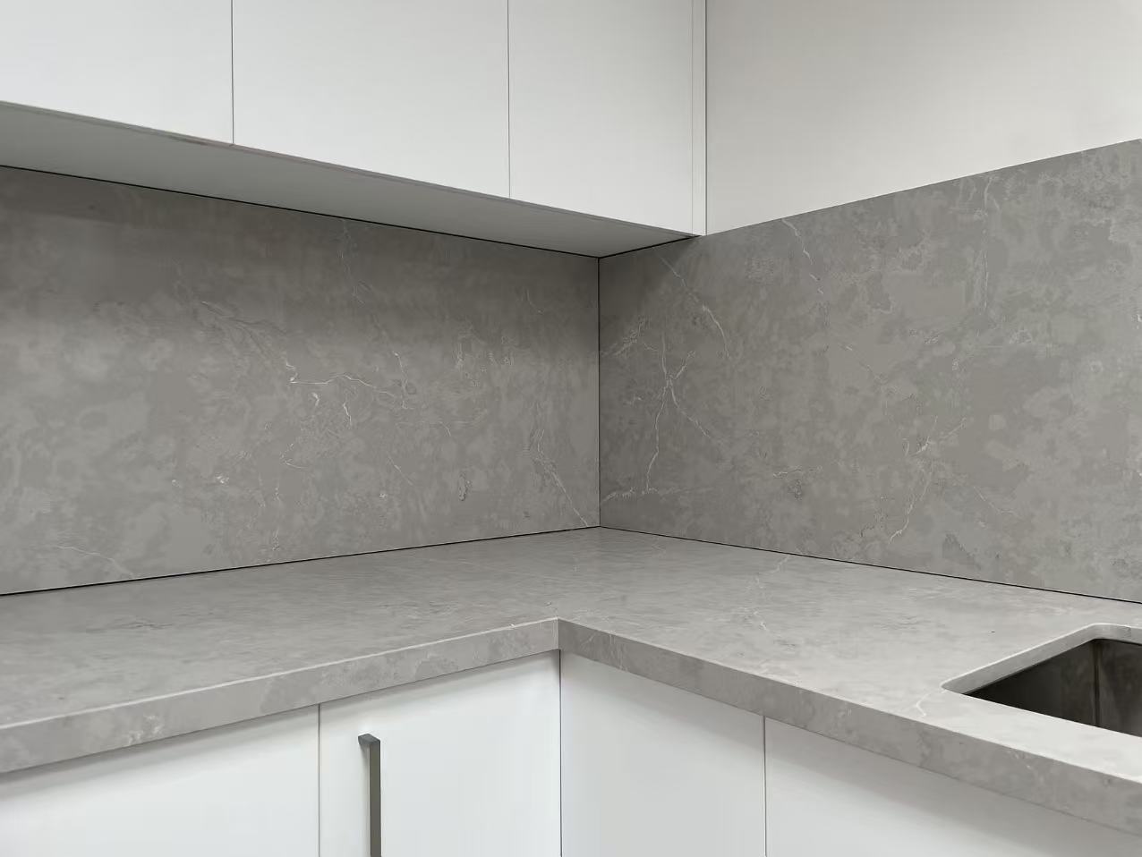 AC Stone Enzo Grey is highly durable, non-porous, hygienic, stain-resistant, easy to clean and maintain, making it excellent for indoor living spaces, including kitchen bench tops, splash backs and bathroom vanities.