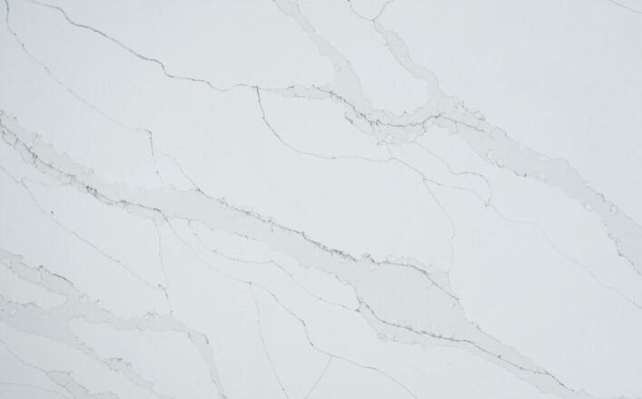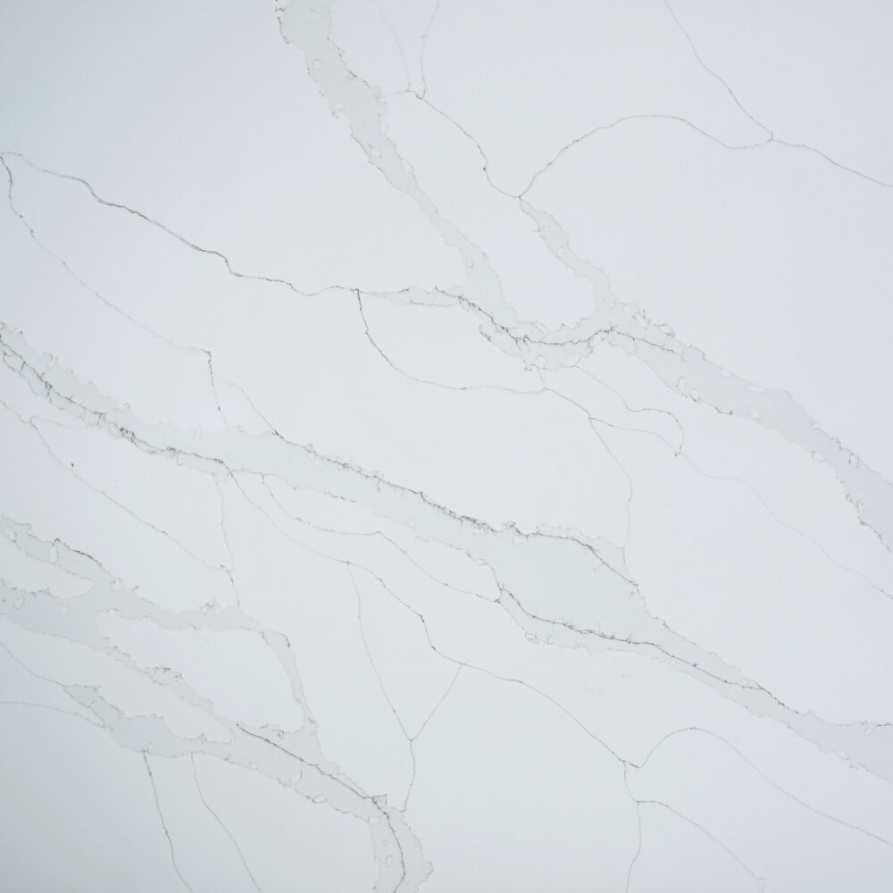 A cool, white background with ultra soft, pale grey, calacatta style larger veins blended with fine subtle warm toned veins that gracefully drift across the surface showcasing elegance at its best.