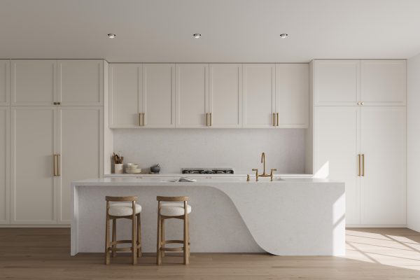 A creamy-white base layered with golden cararra veining, elegant and expressive. The perfect versatile stonepiece with a warm palette across your project.