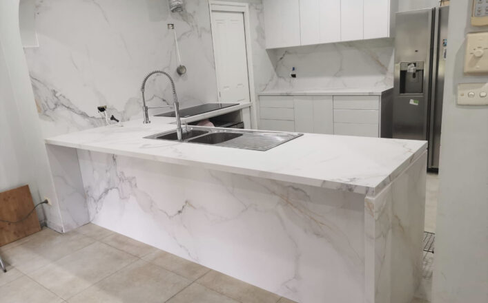 Artistic and modern, AC Stone Lucky Clouds is a unique piece with creative flair. AC Stone Lucky Clouds has a smooth white base with golden and grey veins that mimic patterns of clouds in the sky. Just like its name ‘Lucky Clouds’, this piece embodies a sense of tranquility through its soft and comforting design. AC Stone Lucky Clouds can be used for a wide variety of surfaces including kitchen bench tops, counter tops, splash back, bathroom vanity, bathroom walls and more.