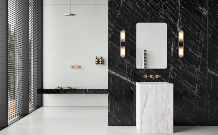 Cosentino introduces Oihana, a unique selection of Brazilian Black Spider quartzite. Its black base is interspersed with endless white veins and gold speckles, creating a whimsical pattern reminiscent of the sweeping, elegant silk threads of a spider’s web. This inimitable natural stone is further enhanced by Sensa’s exclusive stain-resistant protection technology.