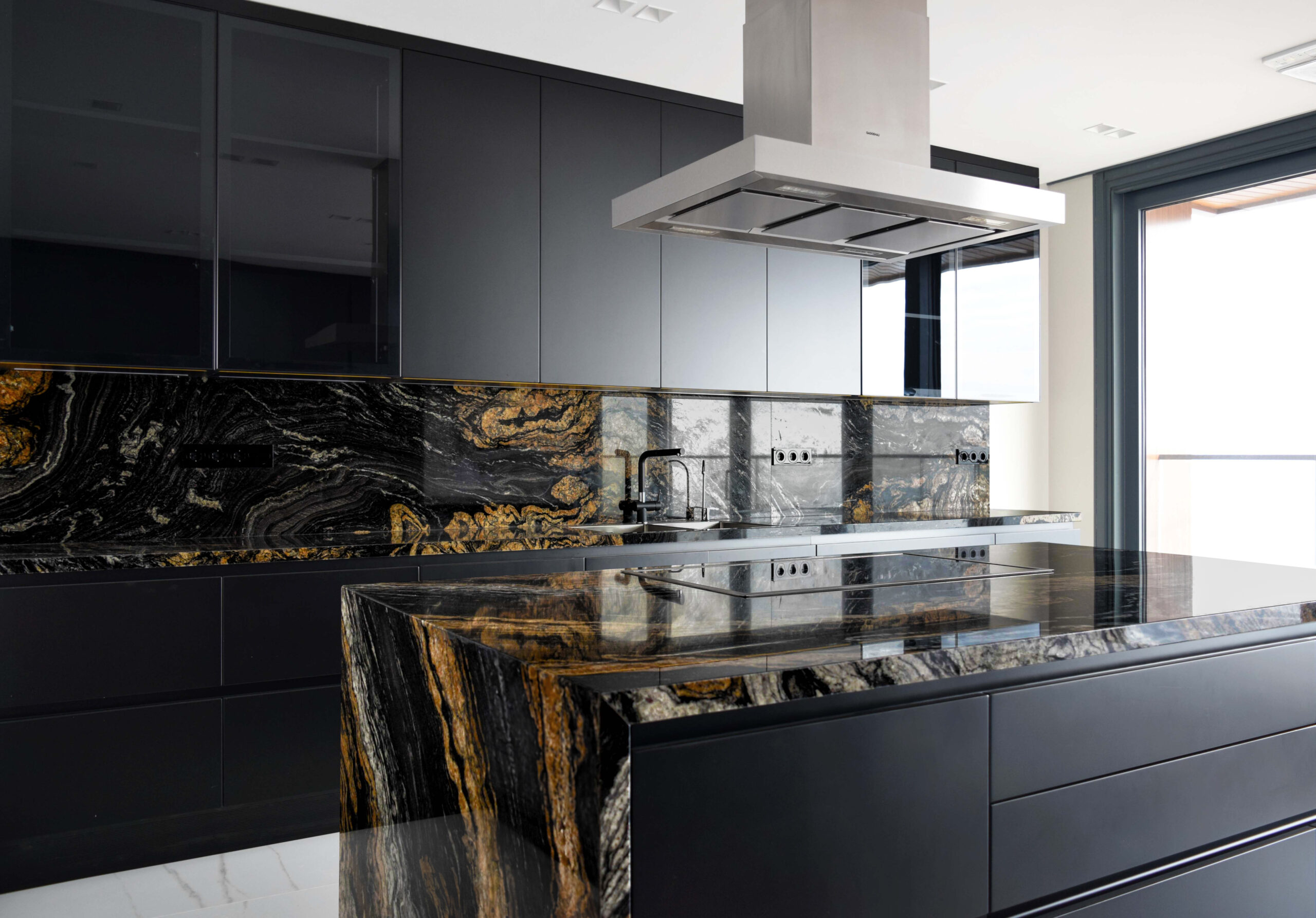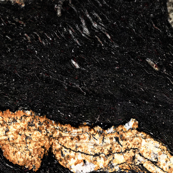This wild granite is created based on veins of white, gold and copper that ripple on the intense background