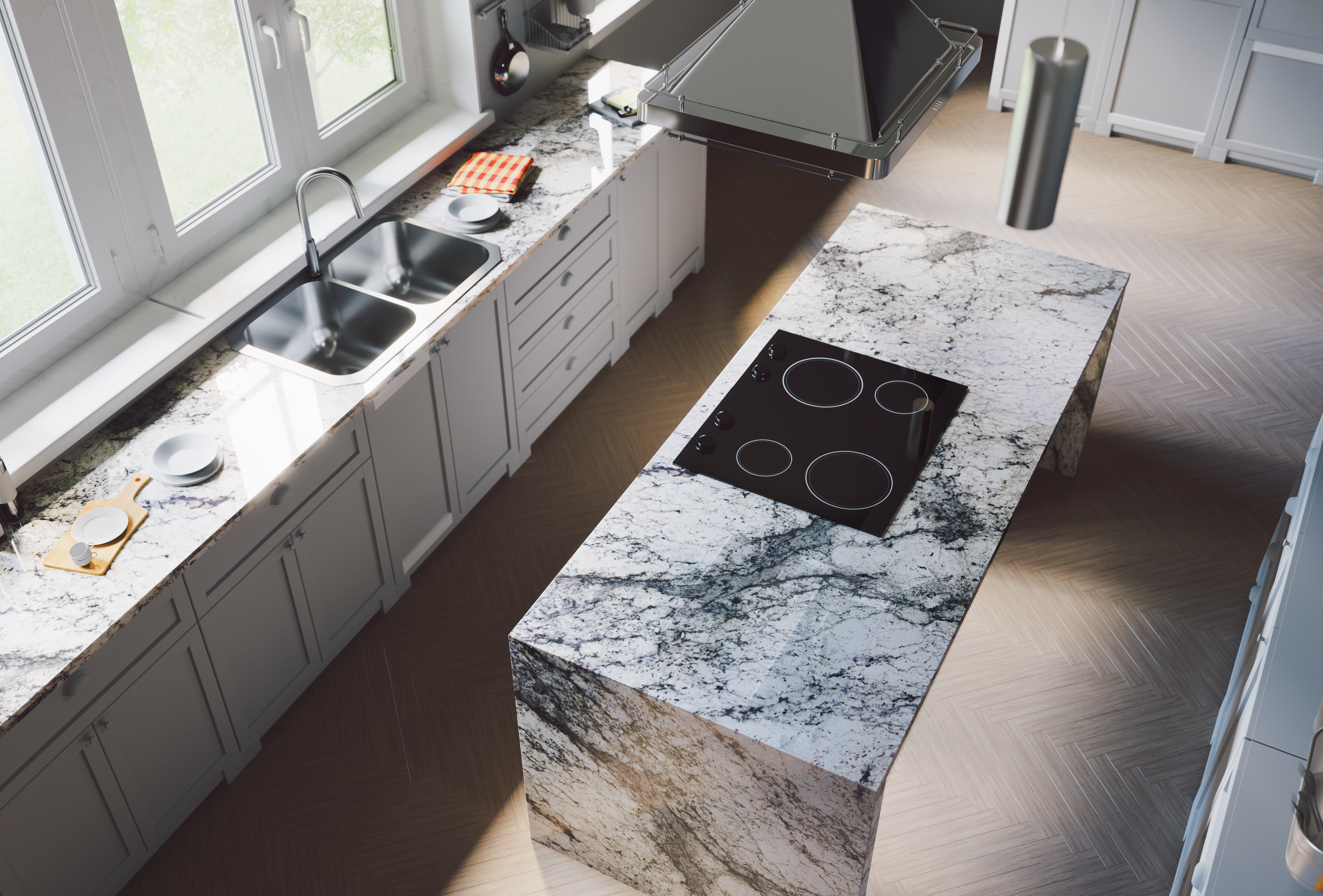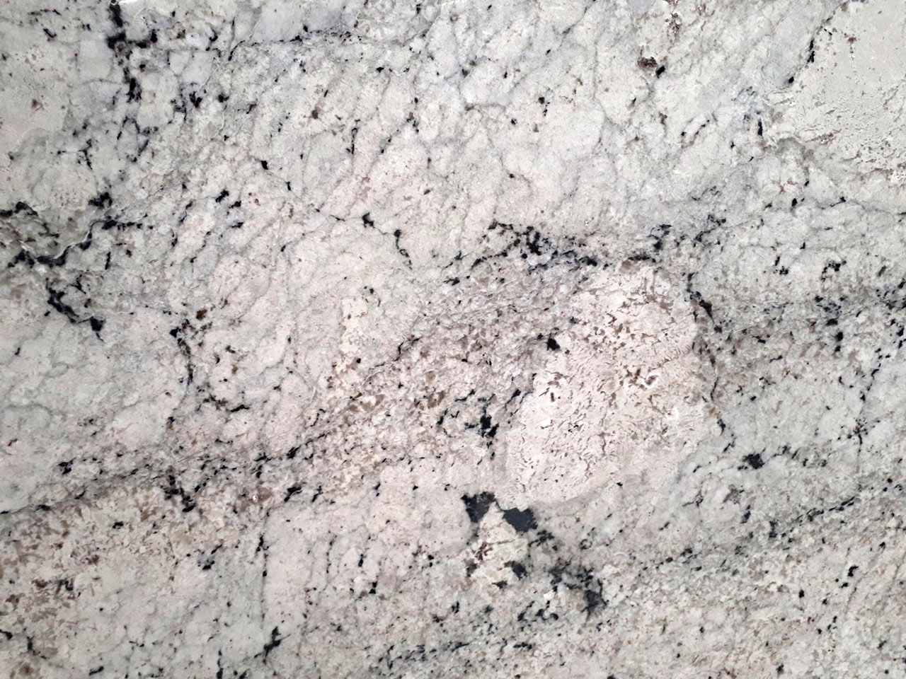 Brazilian granite featuring a grey background with a mixed structure in shades of white, grey, taupe and black.